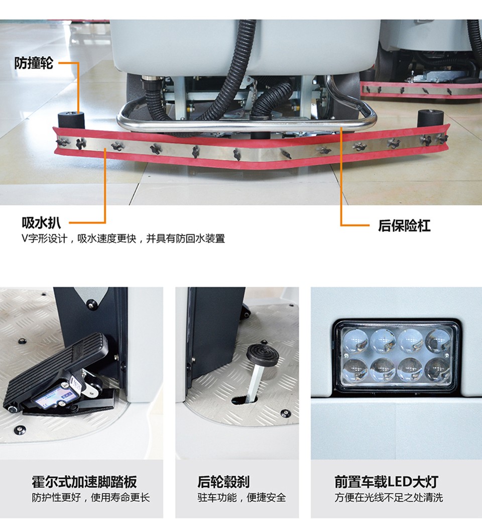 大型高效,性能卓越。大型駕駛式洗地機,采用整體前驅電機,加大驅動功率。
